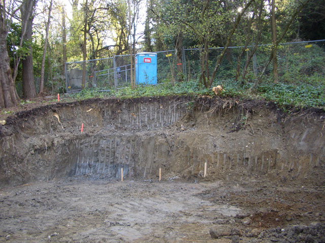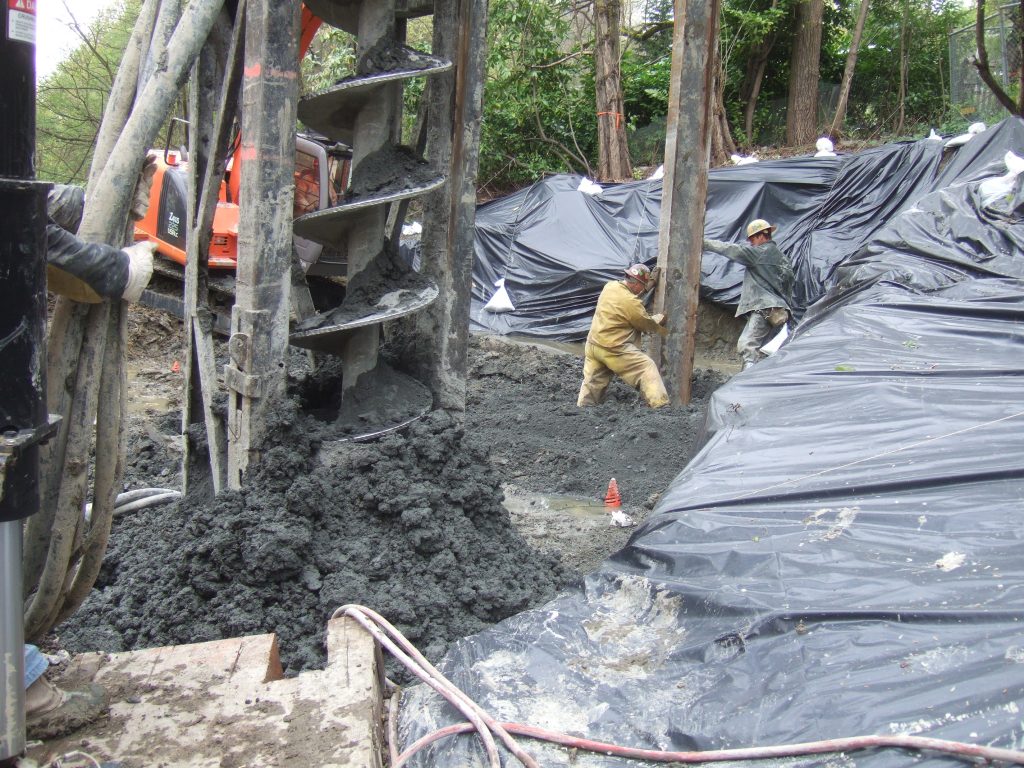 Steel pilings, consisting of ten 18" I-beams encased in 24" diameter concrete were placed 48 feet into the ground, and tied back into the hillside with grouted in place cables extending 60 feet to the East.