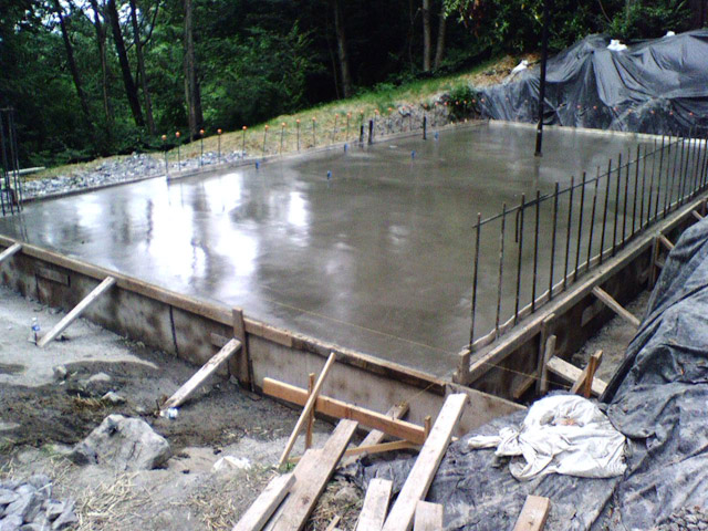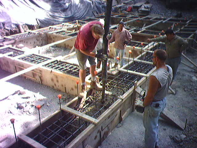 Atop the pilings, a grid of 24" x 24" grade beams were poured, topped by an insulated 8" structural slab.