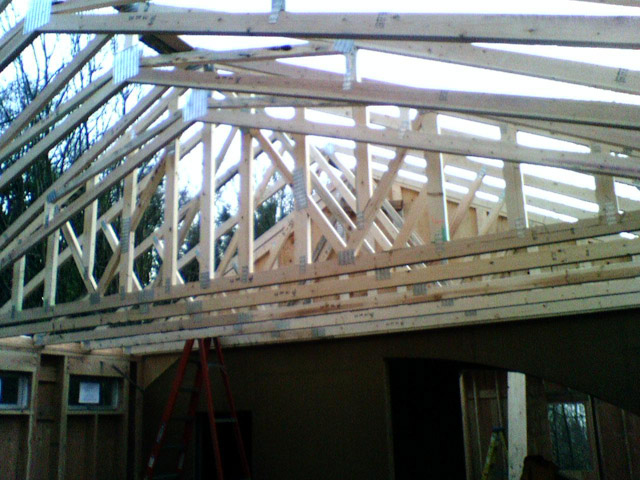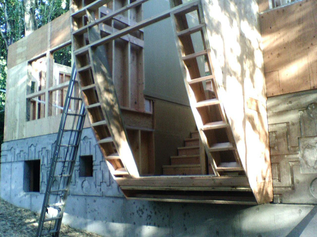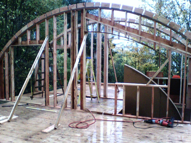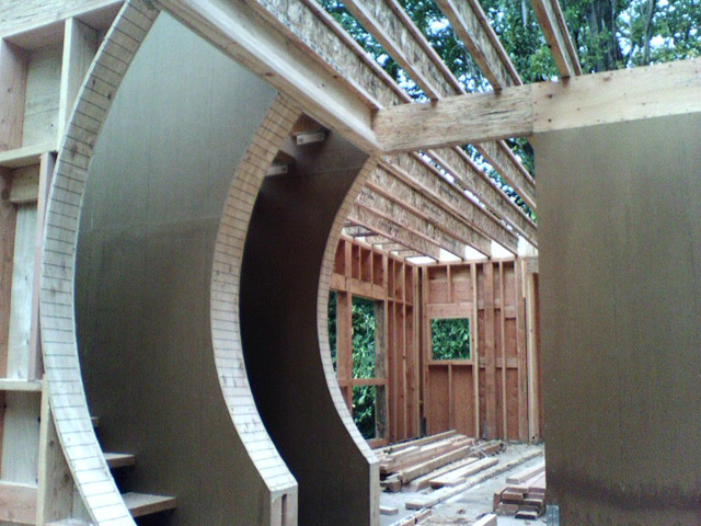 With the concrete in place, framing began, consisting mostly of conventional framing with a trussed roof, consisting of both standard and scissor trusses. The round "Stargate" section presented some unusual challenges, as it acts as the shear core of the house, but also incorporates the stair and bathrooms.