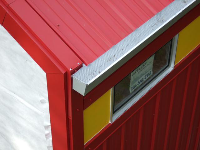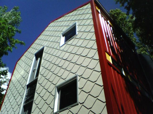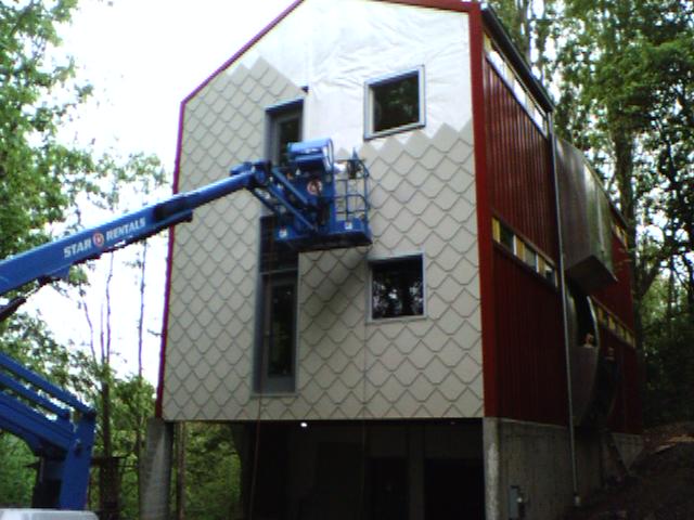 Once the plumbing, wiring, and insulation had been completed, we began to close in the exterior, using a number of different siding systems and custom metal flashing and trims included in the unusual design of the house.