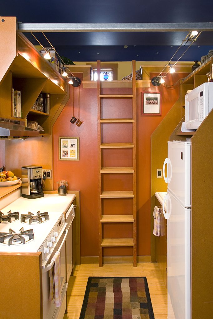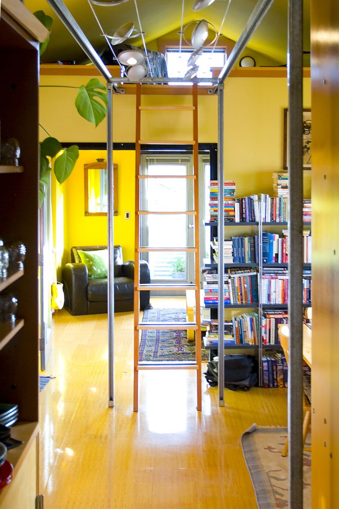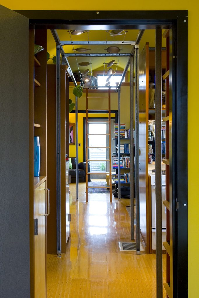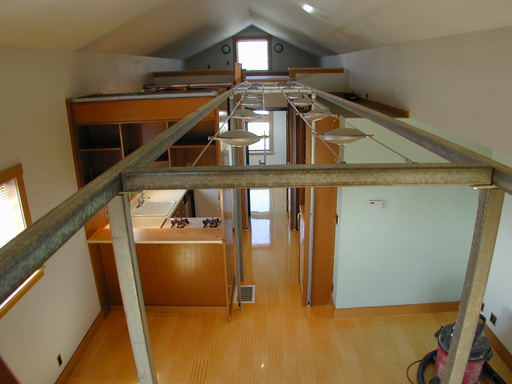 In order to keep the three main spaces on each floor as clear as possible, and to provide a contrasting “high density” feeling to set off the open nature of these central spaces, the side bays are double loaded with functions such as sleeping lofts over the closets and bathrooms.