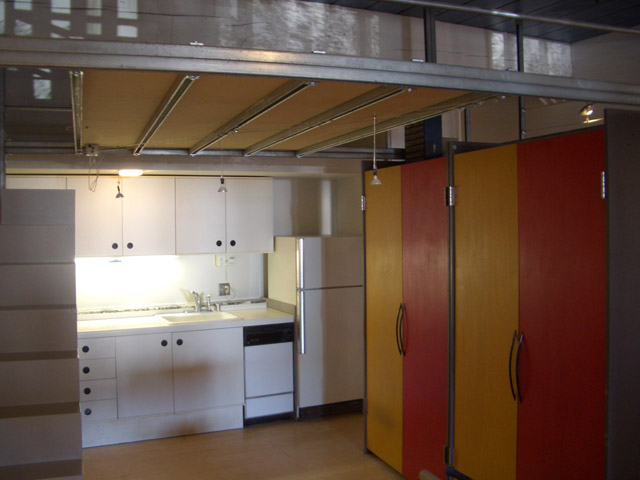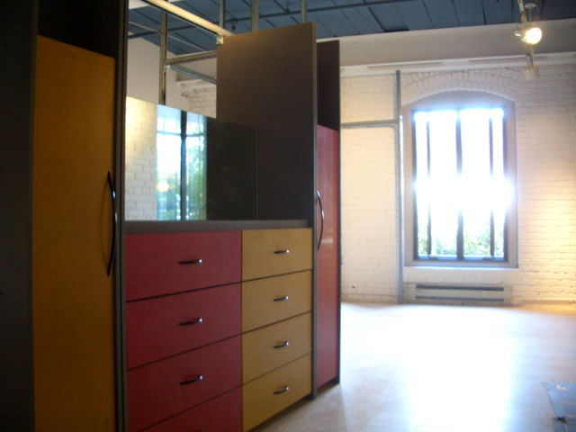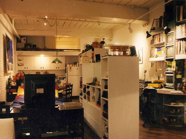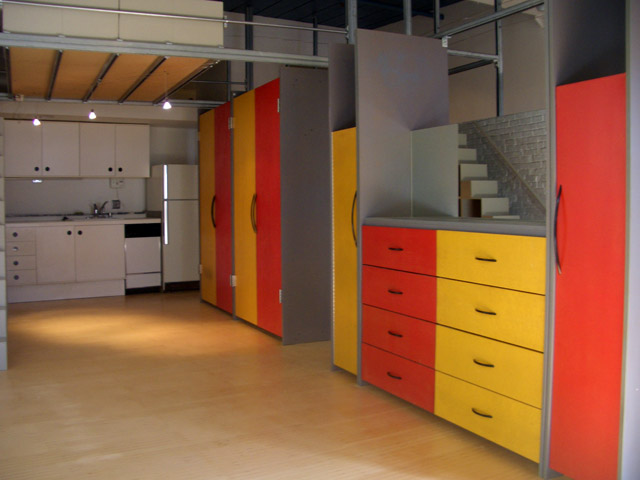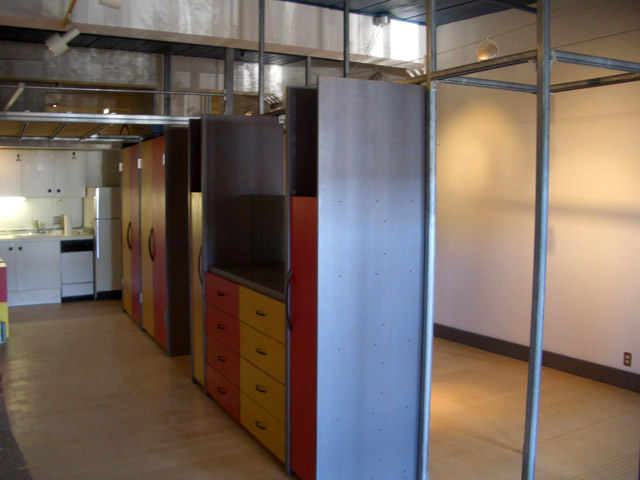 Architect designed built-in furnishings (loft bed, wardrobes, dressers, cabinets and bookshelves) create separate areas for living, dining and sleeping.